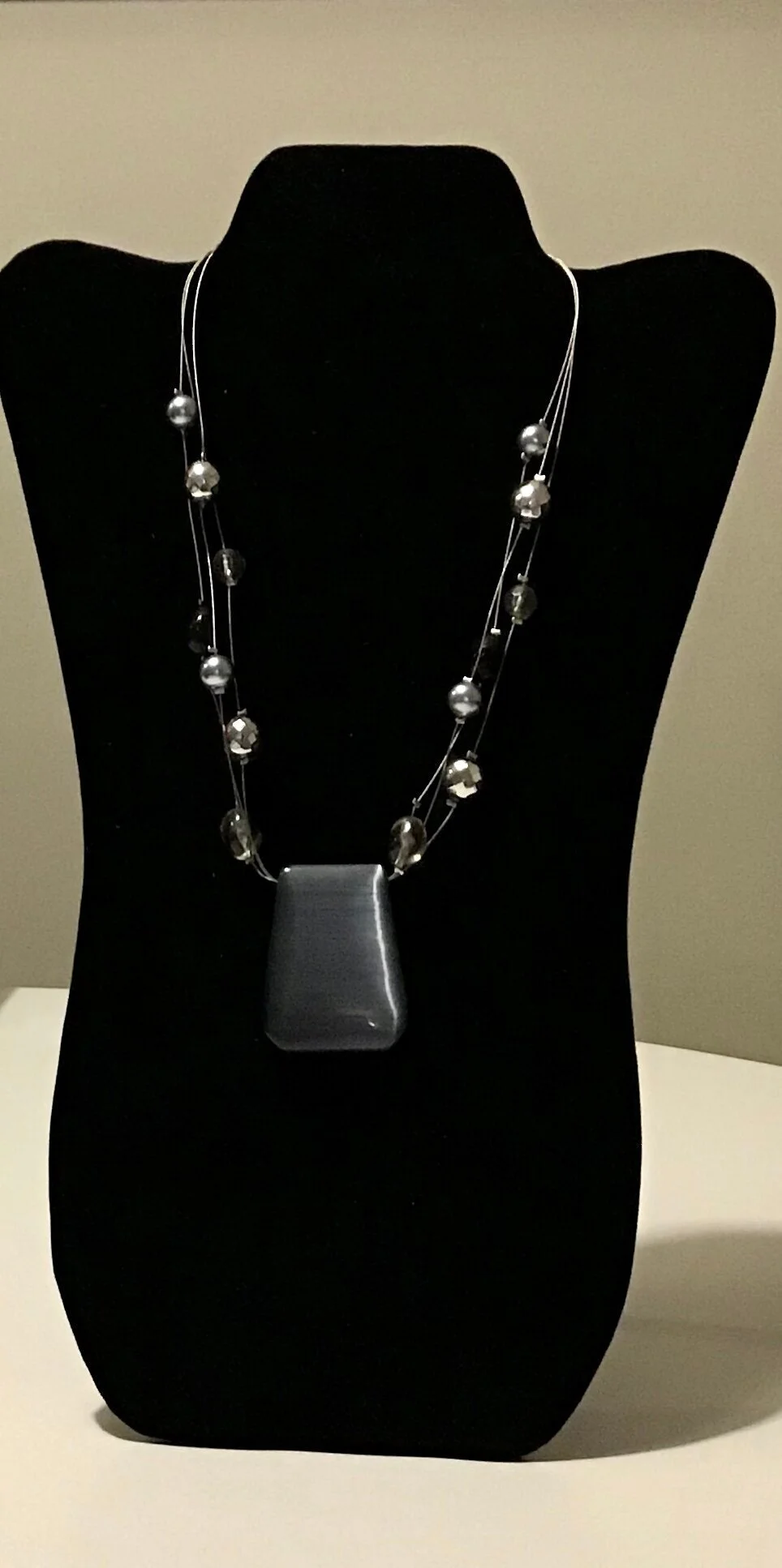 Silver, platinum, and clear 3 strand necklace with pendant. Suggested pairing for this “must have”…is a lavender sweater dress, one of the coveted colors of Fall/Winter 2020. Color Trend Alert!